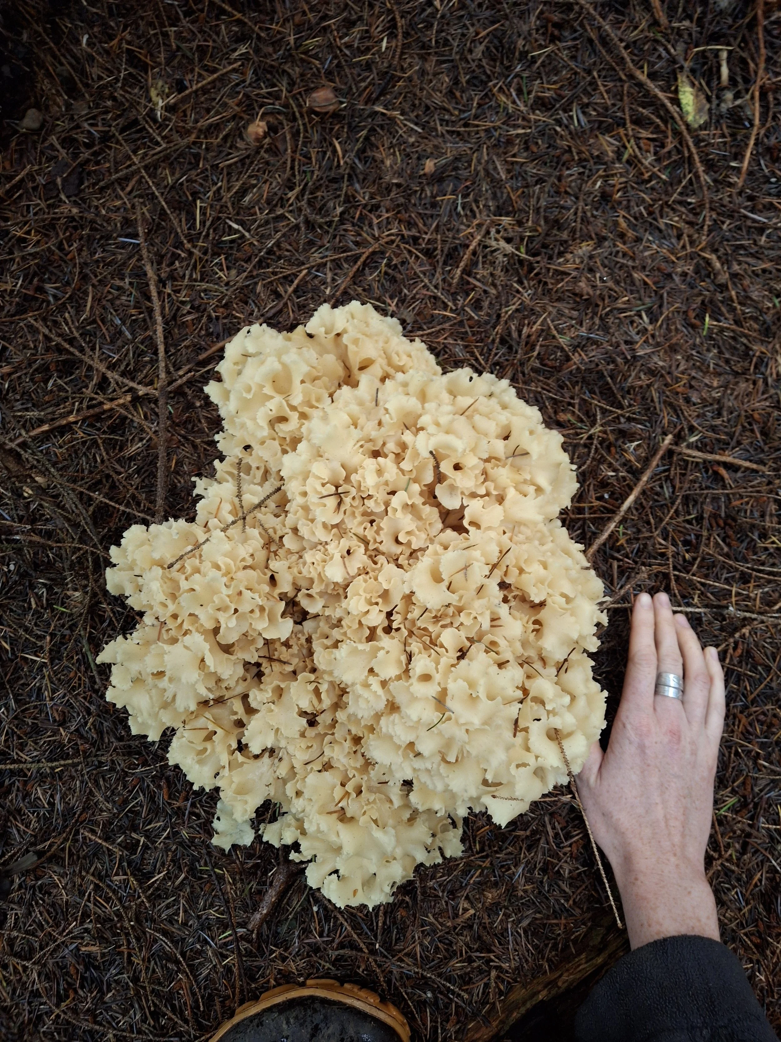Harvest and Sustainability: You will find the Cauliflower Mushroom growing in the fall, September-November. It typically needs moisture, so I check after a good dump of rain (with a buffer for growing time). They will be growing with and on the base and roots of conifers, favoring older, declining hosts. This mushroom is a perennial, so it will fruit in the following years, in and around the same spot. If you find a Cauliflower mushroom, save the location and time of year, and check back in next year! It is always in best practice to respect its habitat and only take what you need. As a cauliflower mushroom grows as a single head, you will harvest the whole thing, but because of its deep-rooted stalk, cut it at its base, so as not to do too much damage to its hyphae network. I have found it to be more rare to forage a Cauliflower as they usually are growing alone, however their size is advantageous as you only need to forage one to have a haul for many dinners’ worth.