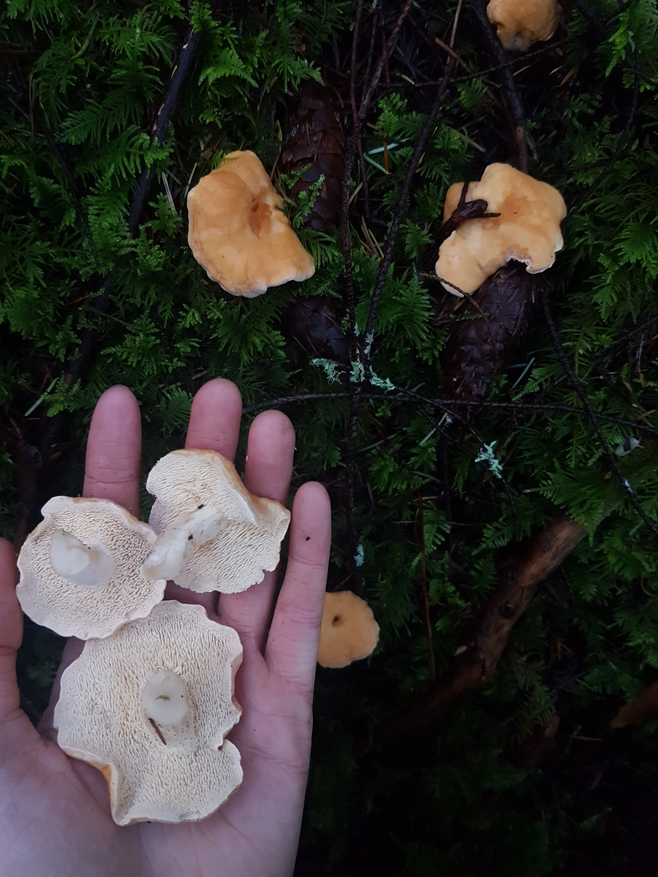 Harvest and Sustainability: You will find Hedgehogs typically in fall and through the winter in milder coastal climates. They grow in scattered groups, in middle-aged, not too dense, conifer forests. I have read that you can also find them in deciduous forests. Usually, they overlap with the end of the Chantrelle season. I also find them growing in similar areas to Chantrelles, if not in the same areas I had foraged Chantrelles earlier in the season. This is a good place to start looking for Hedgehogs! I find that when foraging and trying to spot Hedgehogs, the tops of their caps have a similar-looking texture to that of a Chantrelle as well. This makes sense since they are close relatives! Their fleshy and smooth quality often sticks out from the more matte and textured understory of the forest.
