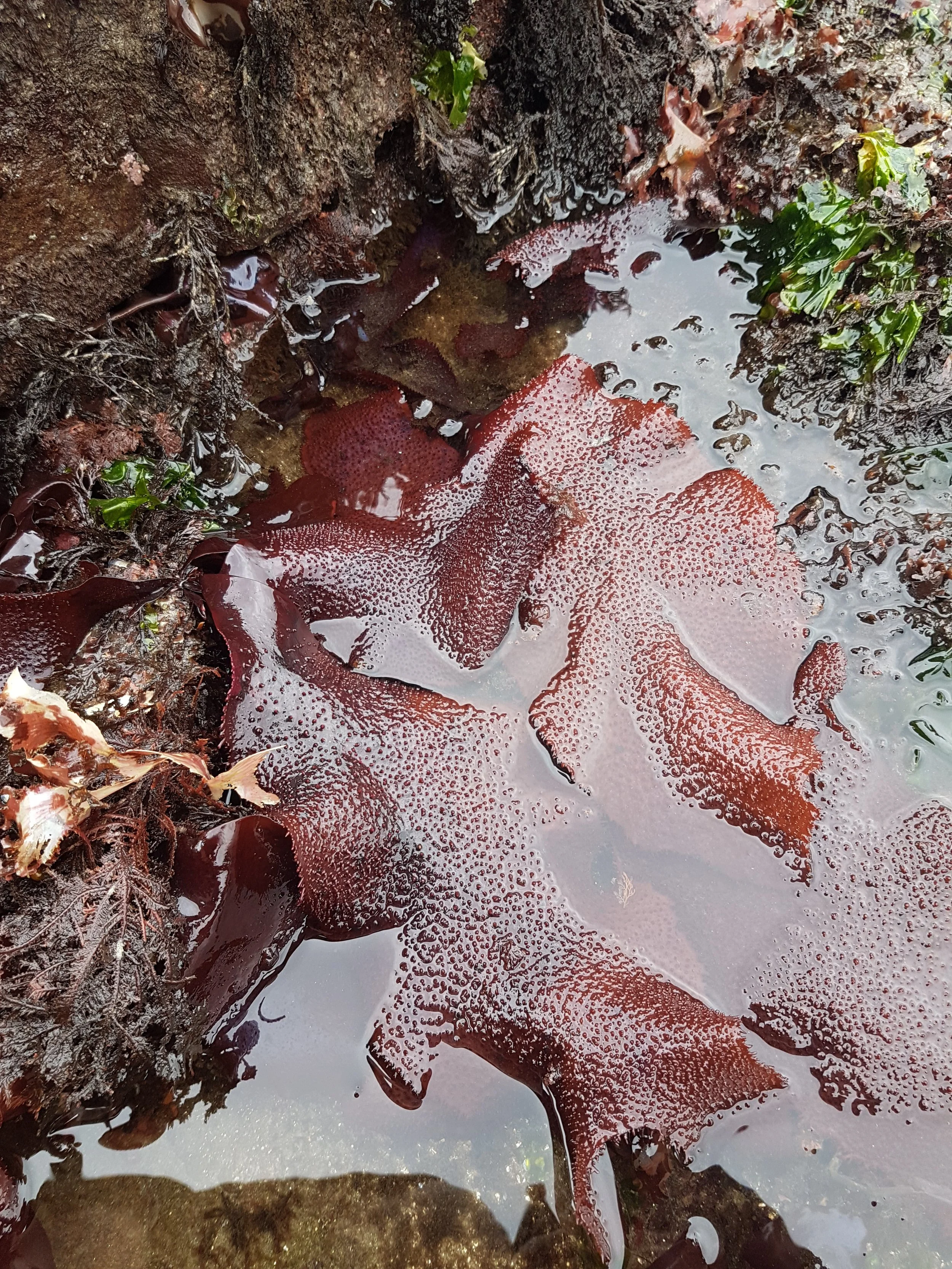 Look-a-Like: Mastocarpus papillatus, known as Turkish Washcloth, has similar qualities and properties to Turkish Towel. As the name suggests, the washcloth is much smaller than the towel, about 15cm max. Its blades are branching, and many are attached to one anchor. Its colour can be much darker and deeper. They have the same rough texture of the papillae, but some blades are smooth and don’t. This seaweed has the same gelling quality as Turkish Towel, but it is smaller and more tender, making it edible.
