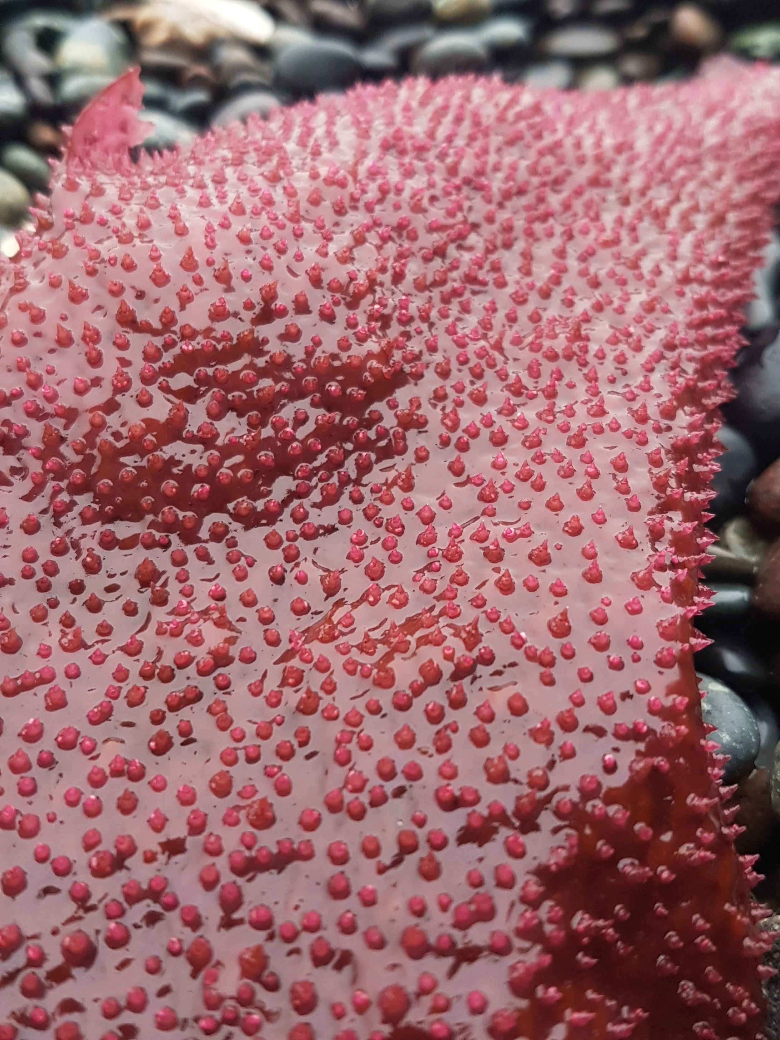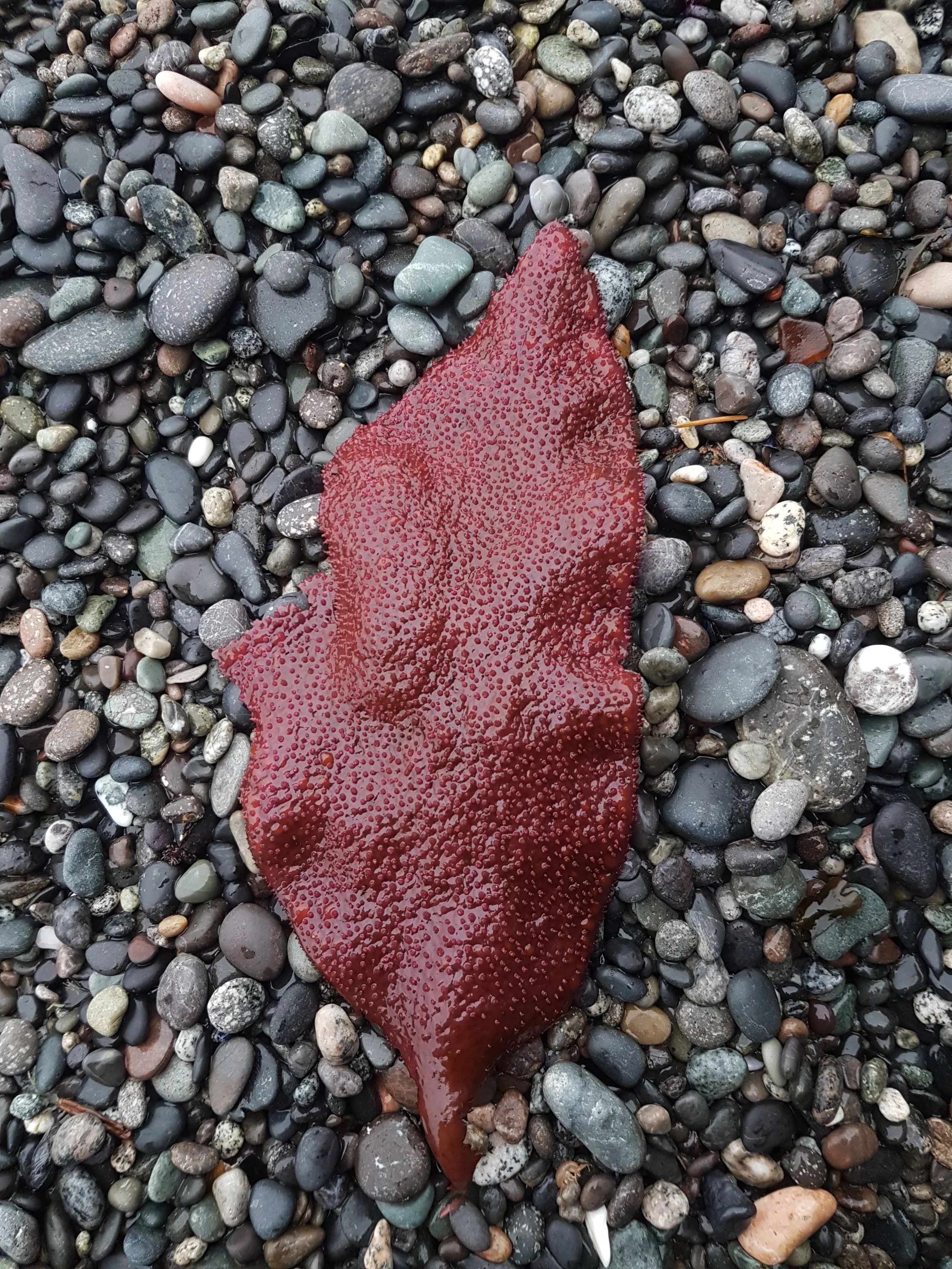 Description: Turkish Towel is a perennial red algae that mainly grows in the intertidal-subtidal zone. The seaweed usually grows as a single blade attached to a rocky substrate. Occasionally, the single blade is accompanied by more blades attached at the same point. Its blade is thick, oval in shape, tapering at each end (lanceolate), and grows to be 30-50cm long. It has been recorded to grow to 100cm. Blade shape and thickness may vary depending on growing conditions: light, currents, and temperature. Its margins are smooth and slightly furled, but grow to be toothed and jagged in warmer waters. Its colour is a deep burgundy colour, sometimes closer to purple or almost brown. The faces of its blade have many small spiny teeth called papillae growing from them. Running your hand along this kelp feels rough like a cat’s tongue.